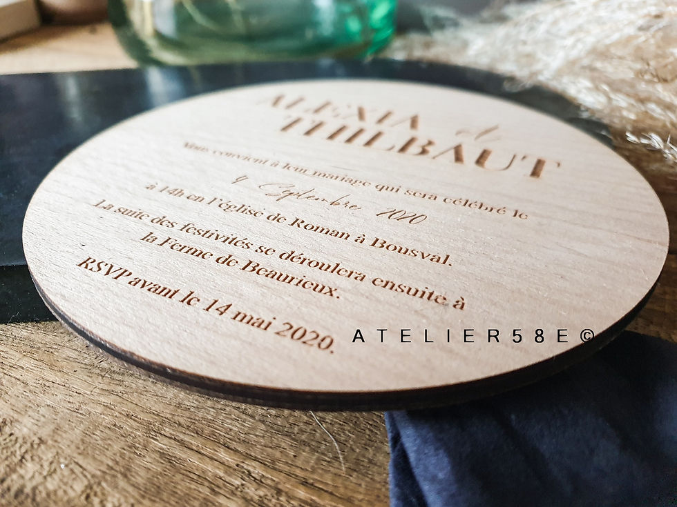 Faire-part mariage chic et rond gravé en bois ou en plexiglas